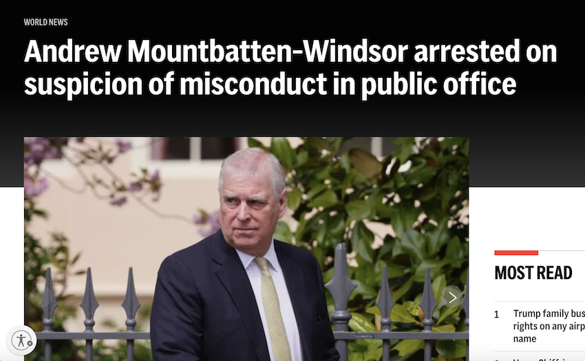 Screenshot Headline in white font on black background reads: “Andrew Mountbatten-Windsor arrested on suspicion of misconduct in public office” Below is a picture of a white man in his 60s in a dark suit and gold colored tie, standing alone in front of a low fence and greenery.