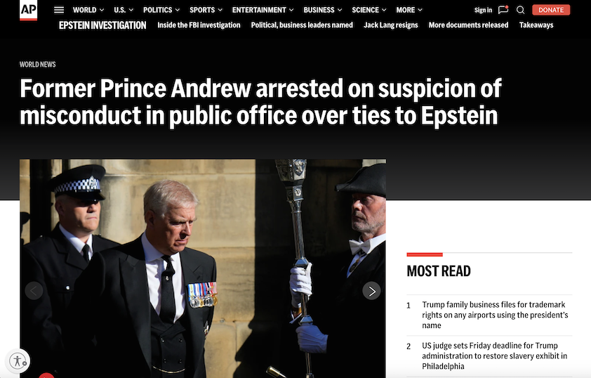 The AP put out an article that I read this morning that stated clearly that Andrew Mountbatten-Windsor’s arrest was for “misconduct” while in public office. When I read the whole thing, it detailed that he had been arrested because of a Thames Valley Police investigation that showed Andrew allegedly sent confidential British trade reports to Epstein. The UK police were led to do the investigation because of the US Department of Justice’s release of so many Epstein files.